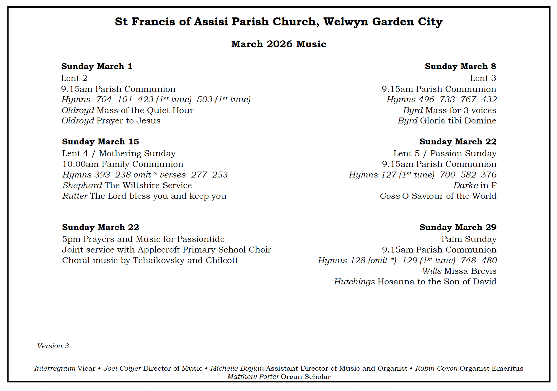 Established in 1935, the Choir of St Francis Church is regarded as one of the best church choirs in Hertfordshire, and is one of very few in 2025 where children continue to sing the treble line of the music. The choir maintains a cathedral-style repertoire, singing at the weekly Parish Communion Service and the monthly Choral Evensong, as well as at other special events and trips out throughout the year.